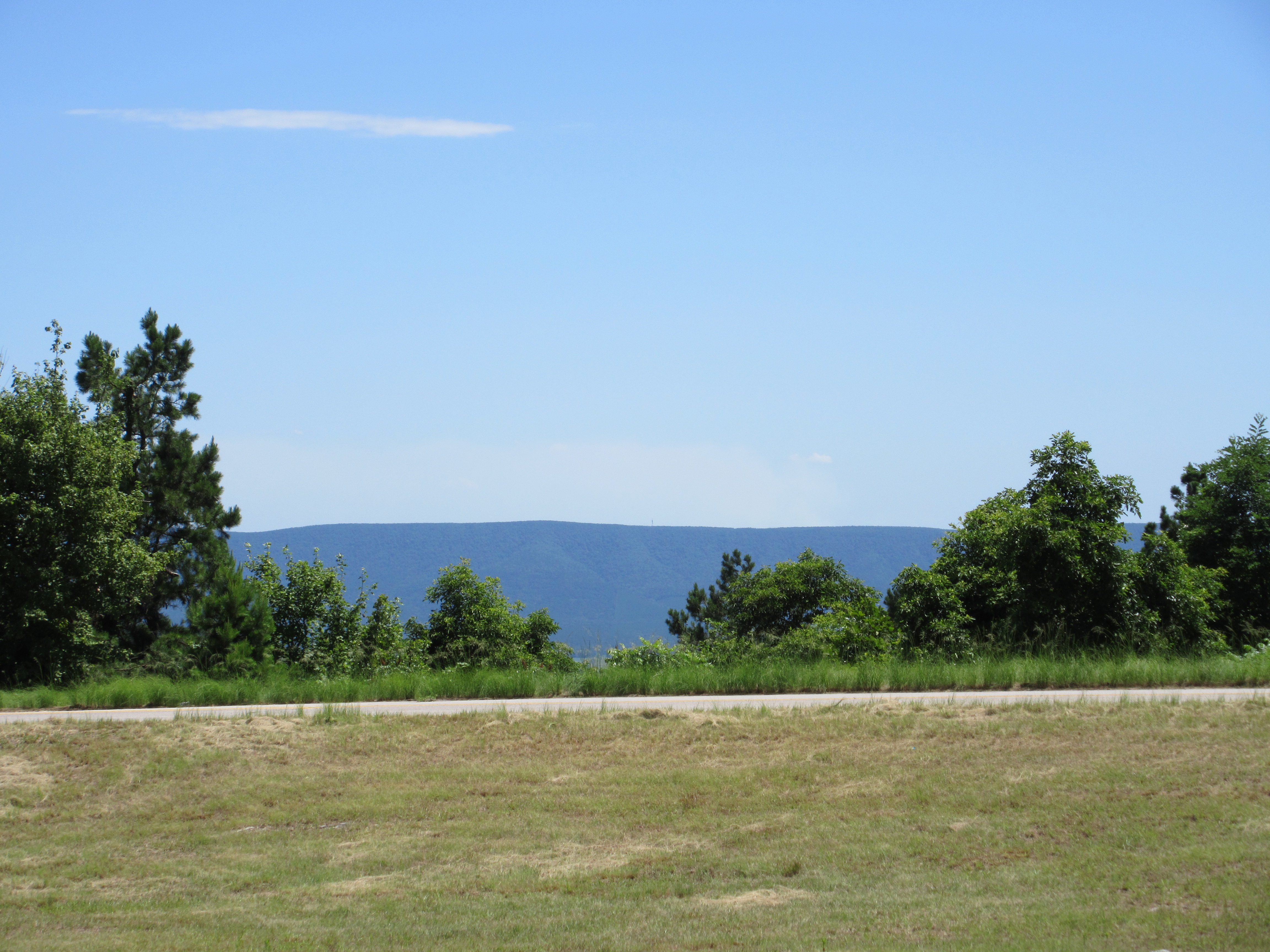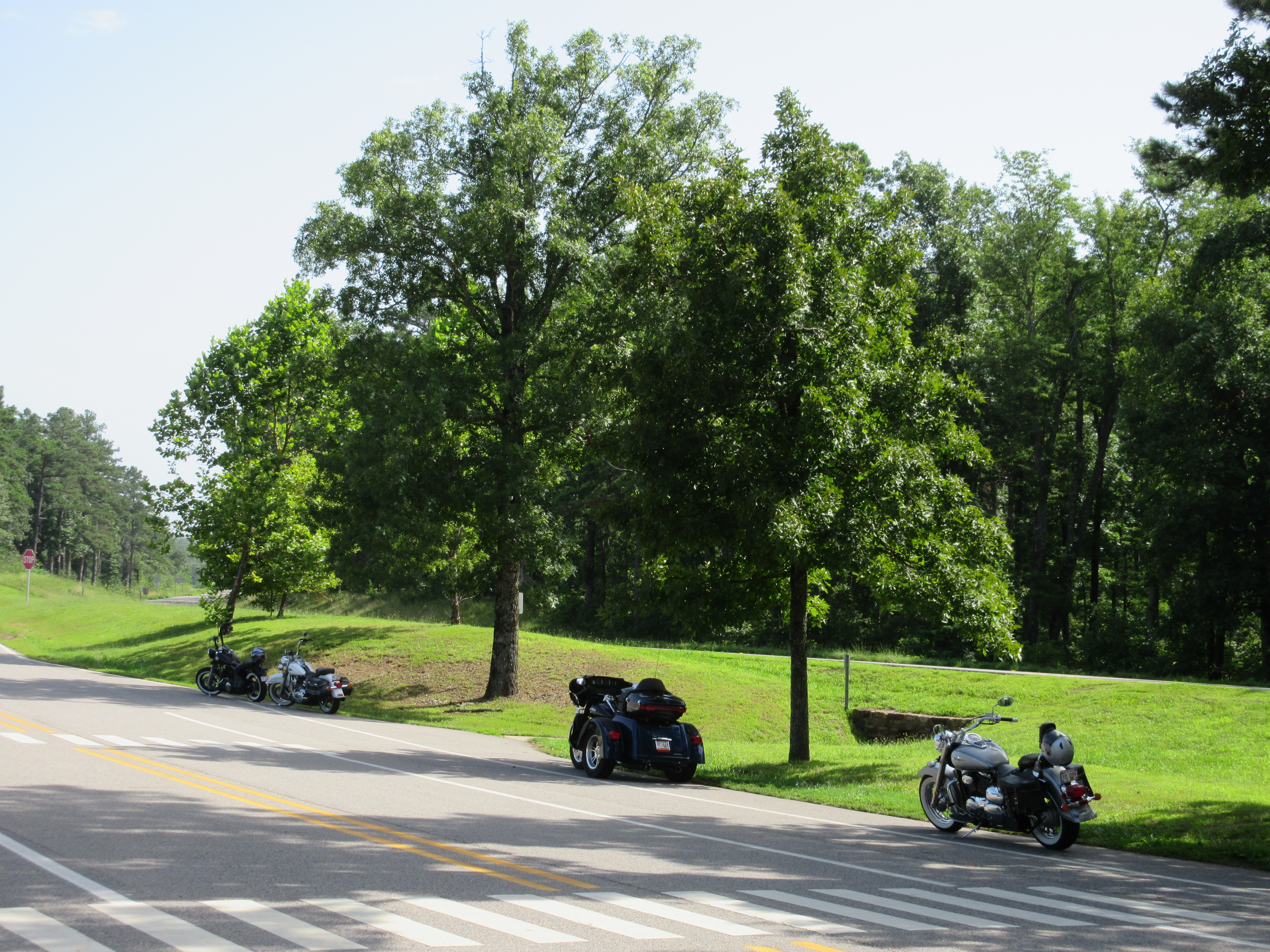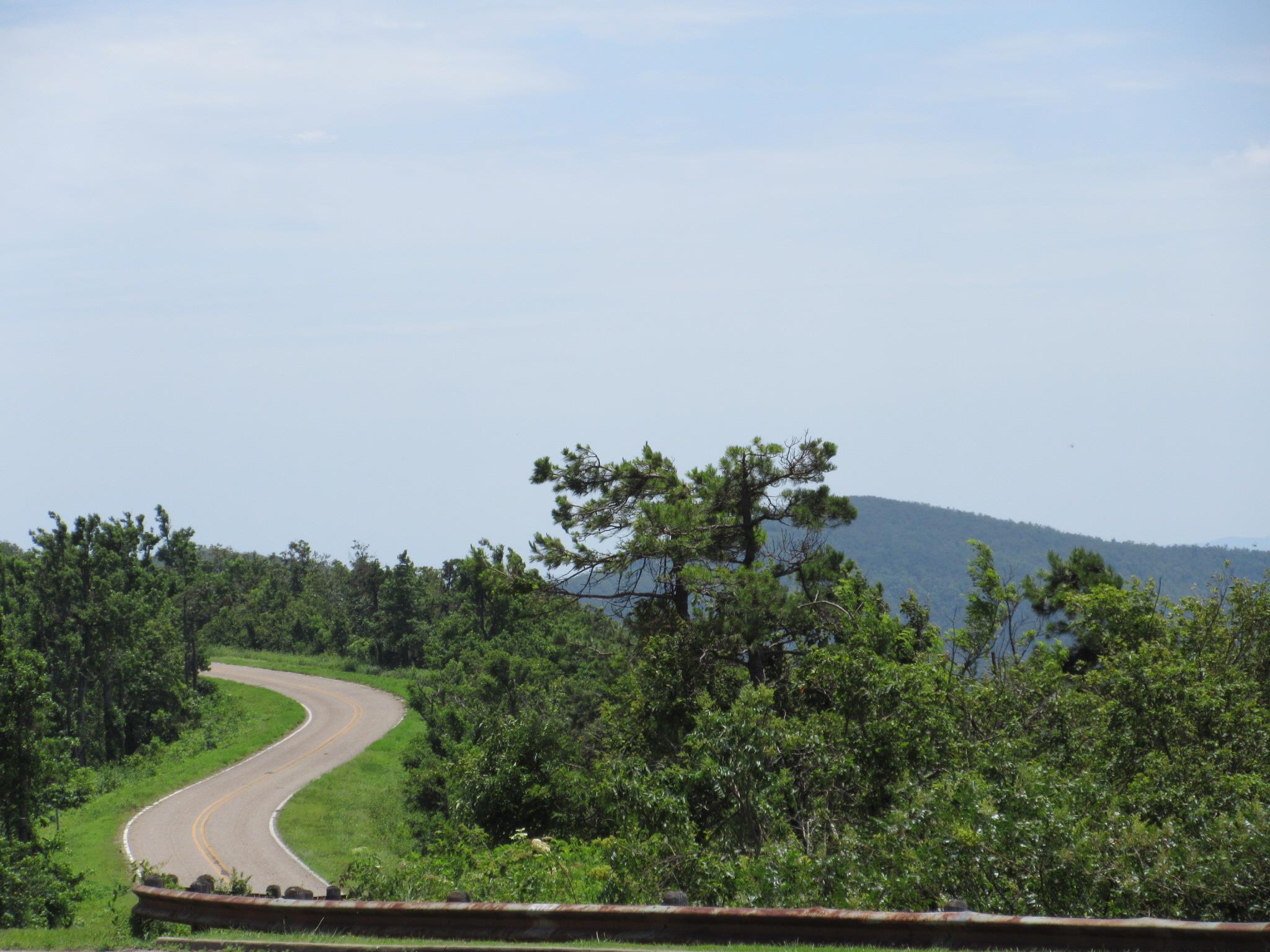 By that time, we thought it best to top off again, and take time to drink some water, because the day was heating up quickly. We met a biker (nice looking, great blue eyes and mischievous smile) at the gas station in Greenland. He told us about his vacation in Colorado, and encouraged us to ride out there if we ever got the chance. He took off and so did we. The ride east across 10 was so relaxing a pretty that it had an almost lulling effect. We pulled over in Magazine, Arkansas to take a break, grab a cool drink and top off again. I forgot to mention that given the anxiety some of our friends and family had about our trip, we would check in on Facebook at every significant stop to let them know where we were and that we were ok. We continued on 10 west when we rolled out of Magazine. By the way, Mount Magazine is the highest point in the state, and is a lovely state park with a very nice lodge.