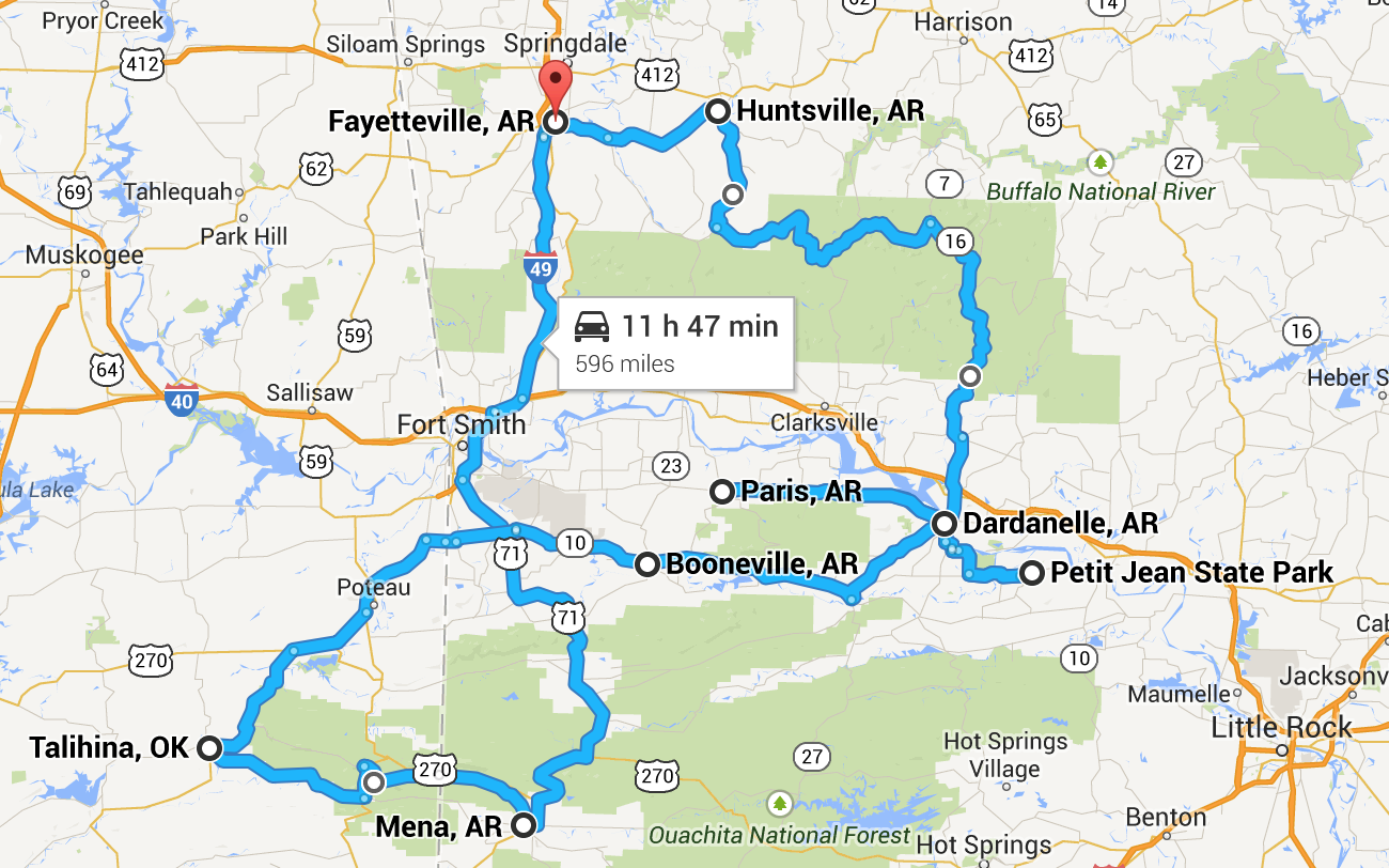 Well, this was the home stretch. We took Highway 74 west out of Huntsville, which dumped back into Highway 16. It’s a route we’d ridden many times, and it felt good to be on familiar turf and so close to home. It wasn’t long before we saw the signs for Fayetteville. As is our custom, I rode with Carol to south Fayetteville before heading back towards home. It had been a terrific staycation, and after arriving safely in West Fork, Carol texted me saying that we had traveled 601 miles. Not much on a per hour basis, but it was One Heckuva Staycation!